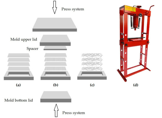 Schematic configurations of 30 vol% guaruman fibers in the mold: (a) continuous aligned, (b) 0–90° cross-laid, (c) short cut randomly dispersed, and (d) hydraulic press.