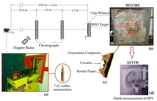 As for the MASs, a 7.62 × 51 mm2 caliber ammunition was used with a 9.7 g projectile and impact velocity of 838 ± 15 m/s, corresponding to an energy of ~3.4 kJ. These MASs ballistic tests were performed at the Army Assessment Center (CAEx), Rio de Janeiro, Brazil. Figure 5a–c schematically shows the standard CAEx ballistic setup for shooting high-velocity ammunition from a gun barrel. In this figure, behind the MAS a block of Roma-type clay witness is placed to record the projectile BFS, which is associated with the depth of penetration. The indentation of this depth of penetration in the clay witness was determined by means of a laser sensor model Q4X Banner (Figure 5d). The laser sensor was manually scanned to obtain the deepest penetration in the clay witness hole caused by the remaining cloud of fragments from the projectile impact against the MAS front ceramic. The deepest penetration measurement was considered the BFS. In order to evaluate the existence of difference between the BFS results, the statistical analysis of variance (ANOVA) was performed.