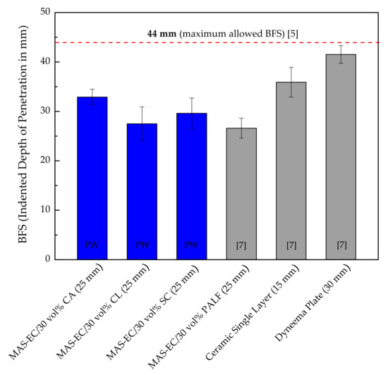 Table 2 presents the BFS, associated with the depth of penetration measured by laser sensor, illustrated in Figure 5c, for MASs with second layer of epoxy composites reinforced with 30 vol% of guaruman fibers in the three distinct configurations indicated in Figure 4. These configurations are now abbreviated in Table 2 as continuous aligned (CA), cross-laid (CL), and short-cut (SC) fibers.