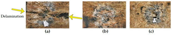 Figure 8 shows the final aspect of MAS targets after the 7.62 mm projectile impact, which completely destroyed the hexagonal ceramic tile; some white fragments still remain attached. In this figure, note that the target with continuous aligned long guaruman fibers (CA) (see Figure 8a) suffered delamination, indicated by arrows, which will not protect against subsequent shootings. By contrast, targets with cross-laid (CL) (see Figure 8b) and short-cut dispersed (SC) (see Figure 8c) guaruman fibers will stand other shooting as required by the NIJ standard [34] for personal protection. This standard requires that a body armor should withstand six consecutive shootings, all with BFS lower than 44 mm in a clay witness placed behind the armor. If delamination occurred in the first shooting, as in Figure 8a, the subsequent shootings have a chance to go through the open delaminated space and cause a complete perforation in the clay witness. In the present work, delamination occurred in the aligned fiber (CA) because the composite has only major resistance along 1D. Cross-laid (CL) or short-cut dispersed (SC) fibers provided 2D resistance, which prevents delamination, as shown in Figure 8b,c.