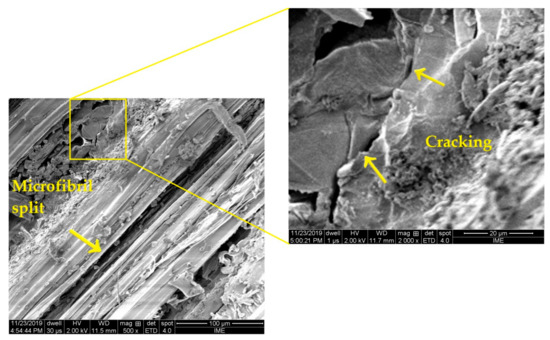 Figure 10 shows SEM images of the fracture surface of epoxy composite reinforced with 30 vol% of guaruman cross-laid fibers after standalone ballistic test. Different than Figure 9, no ceramic fragments exist in this case. The main mechanisms of .22 caliber projectile impact absorption were found to be microfibril split of guaruman fibers, clearly seen in this figure, as well as cracking of the epoxy matrix pointed in the inset. The relatively high strength of the guaruman fiber (614 MPa in Table 1) prevents its rupture and contributes to keeping the integrity of the CL guaruman fiber composite, despite cracking of the epoxy matrix. As in the case of MAS against 7.62 mm ammunition (see Figure 8), the integrity of the CL guaruman fiber composites against subsequent shooting in the case of .22 caliber ammunition is an important requirement for personal ballistic armor.