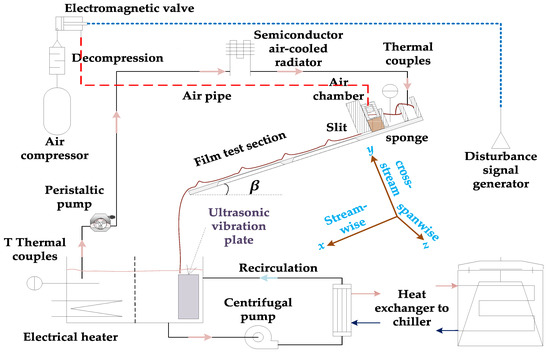Fluid in the flow loop is pumped with a peristaltic pump, which could provide an accurate but pulsed small flow rate. There is a flow distribution part in the film test section buffering and dispensing the fluid into a pulsation-free flow. The flow loop has an additional recirculating loop, electrical heater, and ultrasonic plate, which could maintain constant fluid temperature and particle concentrations. Additionally, disturbances are provided with compressed air regulated by an electromagnetic valve, and the disturbance frequency is controlled by a digital square wave.