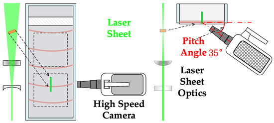 The image plane position ambiguity was caused by the large depth of field and the off-axis setup of the lens, which was compensated for by customized thin laser sheet illumination. The laser source was a continuous wave (CW) Nd:YAG 532 nm laser from Beijing Ranbond Technology Co., Ltd., Beijing, China. It had a maximum power of 6 W. The beam laser was shaped via a plano-concave cylindrical lens (f = −25.4 mm) diverging the laser into a planar sheet, and a plano-convex cylindrical lens (f = 100 mm) reducing the beam waist diameter. As shown in Figure 3, the laser optics were accommodated with an optical cage system using four rigid steel rods to ensure a common optical axis and better mobility. In the experiments, the cage system was mounted on a three-dimensional manual translation stage for precise positioning and focusing.
