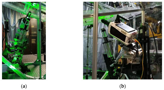 Photographs of PIV/PLIF measurement experiments. (a,b) were photos corresponding to schematic diagrams in Figure 2.