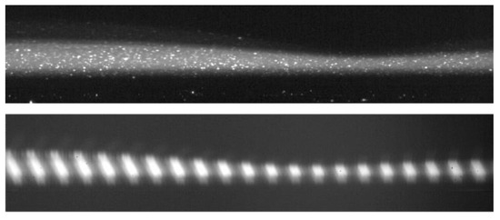 Raw PIV image (above) and SPLIF image (below). The two images here do not rigorously represent the same state of a capillary wave.