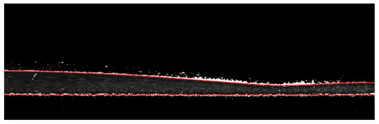 With the image constitutions decomposed, it is possible to identify the interfaces according to the greyscale image. The particle images and fluorescence mixing nature sometimes make the results of gradient-based interface identification noisy. Hence, an interface identification method depending on the fluorescence background contribution in image pixel values was applied in image pre-processing. This interface identification method was still accomplished with the convenience of the MATLAB link in DynamicStudio software. Figure 6 shows an example of interface identification, where the white pixels represent pixels falling into the greyscale range and the red lines are the final interface results obtained after fitting.