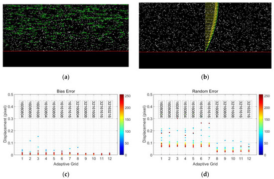 Adaptive PIV test with synthetic particle images: (a,b) synthetic particle images; (c,d) test results of bias error and random error, and the color scheme associated with the data points corresponds to the vertical pixel position. Texts in (c,d) suggested the applied adaptive PIV parameters: the initial 4-digit number were the minimum IA size, and the last 4 represented the grid step size.