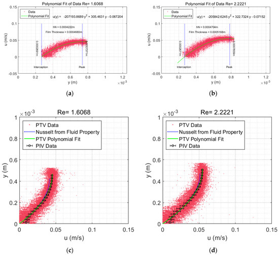 Figure 8c,d illustrates comparisons among the PIV/PLIF experimental results, PTV experimental results and corresponding analytical velocity profiles based on Nusselt’s equation for the Re = 1.61, f = 0 Hz and Re = 2.22, f = 0 Hz glycerol water film flow cases. The comparison showed good agreement among the overall datasets, and a general conclusion could be drawn that the PIV/PLIF film flow experimental results match well with Nusselt’s theoretical prediction for both the film thickness and the velocity profile.