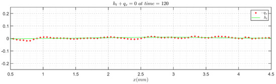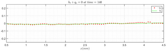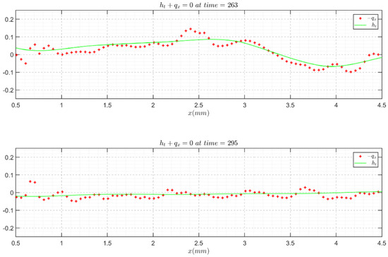 The above validations are mainly based on flat films. To directly check the validity of the instantaneous wavy film velocity field and topology, we resorted to the continuity equation in integral form (Equation (7)) [33], because high-fidelity velocity and topology results would be required to acquire a satisfying reproduction from the experimental outcome. The continuity validation results for Re = 41.05, f = 5 Hz and Re = 7.43, f = 5 Hz are presented in Figure 9 and Figure 10, respectively, as examples, in which the negative value of the flow rate streamwise derivative generally agrees well with the experimental thickness time derivative, assuring the fidelity and accuracy of the PIV/PLIF measurement techniques.