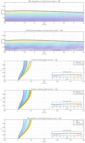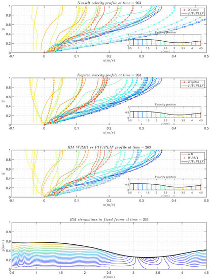 - Self-similar velocity profile assumption based on local film thickness and flow rates, which is given by Kapitza et al. In this paper, we refer to that equation as Kapitza’s velocity profile. This velocity profile corresponds to a first-order correction of Nusselt’s theory, which could adapt the velocity to the deformations of the free surface and changes in the flow rate [35,36,37].From Equation (5), a self-similar velocity can be acquired with an elementary experimental velocity field and film topology.