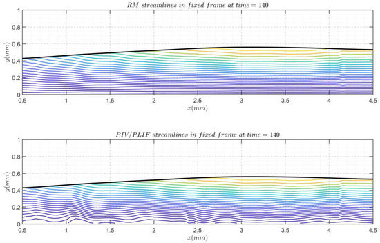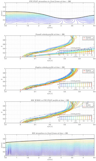 For each snapshot, the velocity profiles are plotted against the model-reconstructed profiles in three subfigures. In each subfigure of the profile comparison, the y-axis represents , which is normalized by the local film thickness to unity, and different colors indicate different profile positions. Moreover, the free surface of the film determined from PIV/PLIF images is displayed in pictograms. They do not cover the entire region because the boundary might introduce some drawbacks when calculating derivatives. In pictograms, different velocity profile positions are highlighted with correlating colored lines to show their streamwise positions in the film topologies. The streamwise velocity field streamlines are also given for the RM results and experimental PIV/PLIF results to present a more direct comparison. However, in the following section, only some of the canonical moment snapshots are presented here. Figure 11 and Figure 12 present the typical responses of the Re = 41.05, f = 5 Hz and Re = 7.43, f = 5 Hz cases to disturbances. Conclusions can be drawn after the careful examination of Figure 11 and Figure 12: