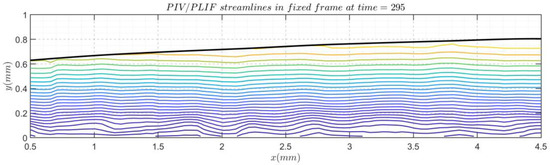 SPLIF, a technique evolved from PLIF, was performed to decompose the acquired image composition. In SPLIF, the planar light sheet is shadowed with a structured plate to form parallel linear illumination, and explicit discrepancies in the fluorescence intensity or orientation emerge after reflection or refraction when light passes through the interfaces [23], which makes it feasible to discern the interfaces and different domains in the image. Figure 5 displays a film SPLIF image, from which it could be inferred that there is a refraction zone above the film–air interface. The bottom of the film domain is estimated to be a projection of the laser plane, the thickness of which is not negligible when the camera is tilted. In addition, the laser sheet thickness is a crucial factor deciding the particle density in the imaged plane and influences the exact velocity profile by the overlay effect in finite volume. In experiments, a thin laser and high particle concentration were adopted to guarantee sufficient particle density with an explicit laser sheet position.