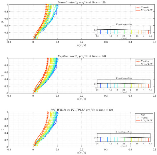 The velocity profiles of the film models used in the velocity field reconstruction include Nusselt’s velocity profile, Kapitza’s velocity profile, the streamwise velocity profile in the two equations of the first-order weighted residuals model (1st WRM) and the second-order regularized model (RM). The streamwise velocity formulas used are given below: