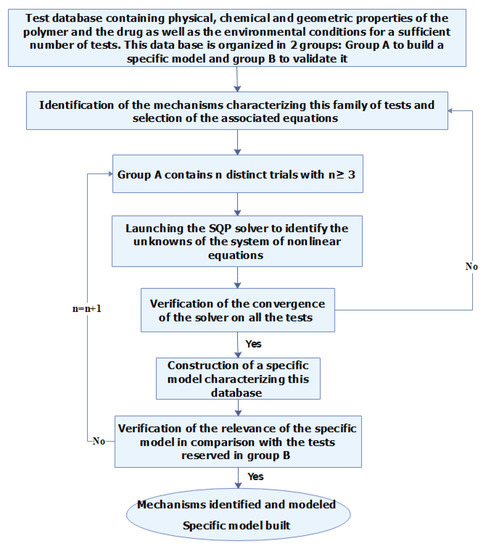 In this section, the developed mathematical model is presented. The proposed method consists of solving a non-linear equations system modeling the all mechanisms identified: burst-release, diffusion, swelling, osmotic pressure, etc. The method operated, known as one of the most effective optimization procedures for solving non-linear optimization problems, is sequential quadratic programming algorithm. Such a problem consists in calculating the factors minimizing a function and simultaneously respecting the imposed constraints. It is a Newtonian algorithm applied to the first order optimality conditions of the system. It finds the solution of nonlinear problems through linear approximations. The quadratic sub-problem (QP) generated is solved following to the steps described in the flowchart bellow (shown in Figure 2).