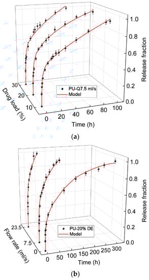 Figure 13a,b show the predicted drug release profile by the model for the PU matrix loaded with 15% diclofenac at the flow rate of 7.5 mL/s, and 20% diclofenac at the flow rate of 6.5 mL/s compared to the experimental release data. It can be noted that in both cases a good correlation exists between the model and experimental results.