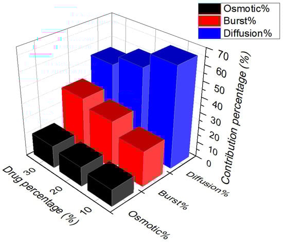 Percentage of the contribution of each mechanism during the drug release from PU films with the three different percentages of the drug at the flow rate of 7.5 mL/s.