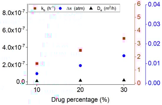 In addition, however, it seems that the diffusion mechanism can be present in all the periods of the release but essentially, it will be the controlling mechanism after the burst and osmosis, where the whole samples become wet and the diffusion can happen in all directions of the sample. Figure 6 shows the variation of the kinetic of burst release, osmotic pressure, and diffusion coefficient versus the initial drug loaded on the samples during the release. It is notable that the kinetics of the release for all the mechanisms by increasing the drug percentages are enhanced. However, it is more evident respectively for the burst release, osmosis and diffusion mechanisms. On can note that generally by increasing the drug dosage, release time is decreasing.