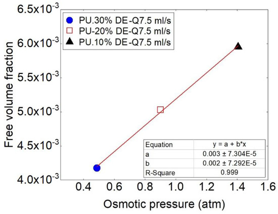 Therefore, the importance of the free volume fraction takes consideration. The value of free volume fraction coefficient by using for PU + 10% drug, PU + 20% drug and PU+30% drug is calculated respectively, which are determined about 4.18 10−3, 5.03 10−3, 5.94 10−3. Figure 7 shows the comparison of the free volume fraction for different percentages of drug and its effect on the osmotic pressure. By increasing the free volume fraction, osmotic pressure also is increased.