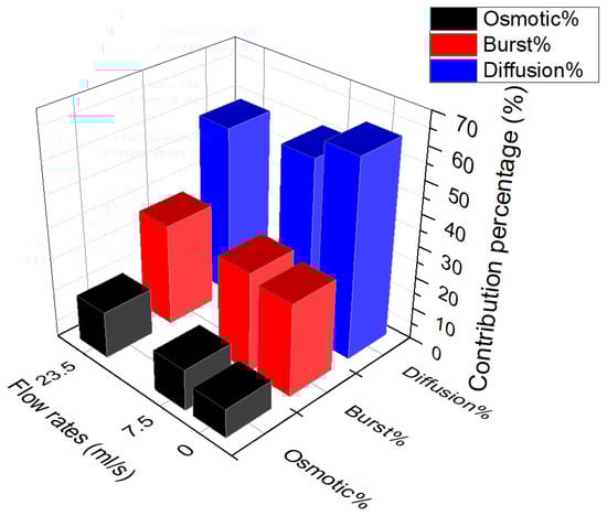 Percentage of the contribution of each mechanism during the drug release from PU films with 20% of the drug at the different flow rates of 0, 7.5 and 23.5 mL/s.