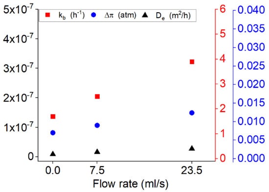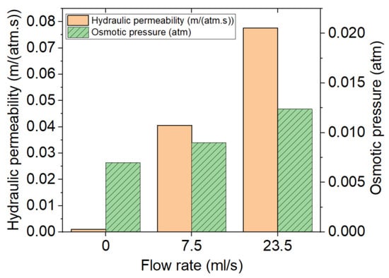 Comparison of the values of permeability and osmotic pressure for samples of PU-20% DE at three different flow rates of 0, 7.5 and 23.5 mL/s.