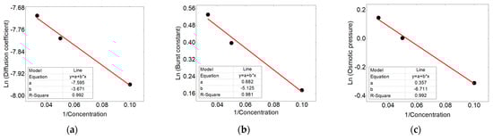 Correlation between (a) diffusion coefficient, (b) burst constant, (c) osmotic pressure in accordance to the concentration adapted to the Arrhenius equation.