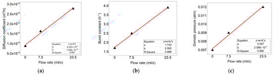 Correlation between (a) diffusion coefficient, (b) burst constant, (c) osmotic pressure in accordance to the flow rate adapted to the linear equation.