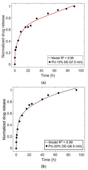 Comparison of the predicted release profile obtained by the model and the experimental data for the case (a) PU-15%DE-Q7.5 mL/s, (b) PU-20%DE-Q6.5 mL/s.