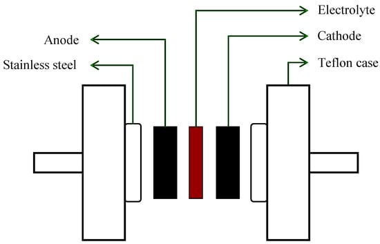 The EDLC was made of two AC electrodes, which have an area of 2.01 cm2 and the maximum conducting electrolyte that was pushed in a CR2032 coin cell (Kuala Lumpur, Malaysia). The outline of the AC electrodes and the maximum conducting electrolyte in the EDLC by using a CR2032 coin cell are illustrated in Figure 1.