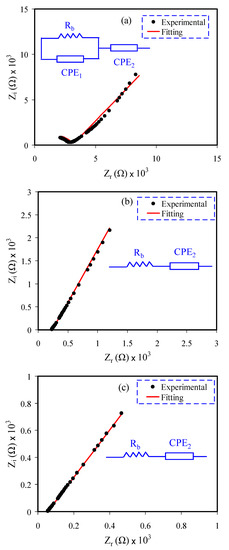 Impedance spectroscopy is used as a well-organized practice to check the DC conductivity of polymer electrolytes. Ion-conducting electrolytes are a group of materials which obtained attention over recent years owing to their uses in a comprehensive number of electrochemical energy storage devices [29,30,31,32]. Complex impedance spectroscopy (CIS) is normally employed to separate a semicircle at a high frequency region, which corresponds to the conduction of ions in the bulk of the electrolytes and a spike at a low frequency region associated with the impact of electrode polarization [1,33]. To get more insights into ion migration in the current study, the electrical equivalent circuit (EEC) model has been studied. The EEC model is a simple method to indicate a picture for each system [34,35,36,37]. Figure 2a–c indicates the impedance plot with EEC model for each film. To achieve the overall picture for each system, the experimental EIS data was fitted with the EEC model. The Figure 2a–c insets indicate the equivalent circuits. Clearly, the semicircle emerged in the impedance plot of CSDN1 (Figure 2a); however, it is missed in the CSDN2 and CSDN3 systems (Figure 2b,c). At the low frequency region, the data points were due to the effect of electrode polarization, which was associated to the double layer capacitance creation between the electrodes and electrolytes. Through using the blocking electrodes in the EIS study, the electrolyte and electrode interfaces could be regarded as a capacitance [38]. For ideal capacitance, a vertical tail in the EIS plots should be seen at a low frequency region. Nevertheless, in this study, a tail angled with smaller than 90° was demonstrated rather than the vertical one. This is due to the double-layer capacitance located at the blocking electrodes or the toughness of the electrolytes and electrodes interfaces [39]. The determination of bulk resistance (Rb) from the Nyquist plot for the electrolyte charge carriers and for two constant phase elements (CPEs) such as CPE1 and CPE2 are demonstrated in Figure 2.