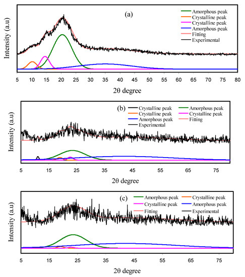 The crystalline and amorphous peaks were separated by the deconvolution method [55]. From the XRD deconvolution, the Xc of the diffraction peaks was obtained as illustrated in Figure 3a–c. It is noted that the sharp and narrow peaks represented the crystalline peaks, while the broad and large peaks are the amorphous peaks.