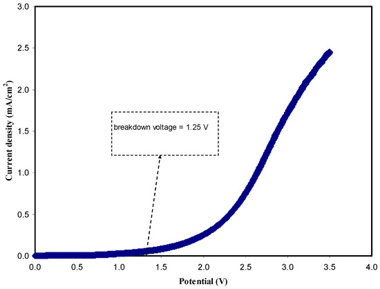 The electrochemical stability and working potential range of the polymer electrolyte is an important criterion due to high performance of energy devices. LSV was carried out to observe the electrochemical stability of the highest conducting CS:DN:NH4I:Zn(II)-complex:GL system. Figure 6 shows the LSV plot of the best conducting CS:DN:NH4I:Zn(II)-complex:GL system at room temperature. No obvious current was observed in the range 0–1.25 V. As the potential goes beyond 1.25 V, the current was recorded to increase gradually. The increase in current indicates the starting of the redox process [59]. At this point, the electrolyte started to decompose and could no longer perform properly. Commonly, the average electrochemical window is ~1 V for proton-based energy storage devices [60]. Thus, the best conducting sample for a CS:DN:NH4I:Zn(II)-complex:GL system can be used to conduct ions for the application of EDLC.