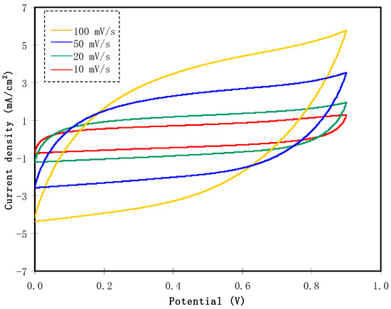 CV plot of the EDLC at current density of 0.5 mA/cm2 and potential range of 0 to 0.9 V for various sweep scan rates.