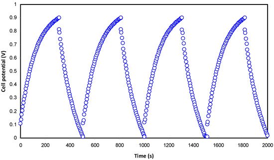 The charge-discharge measurements were performed as the second test using a Neware battery cycler system (Shanghai, China) at the current density of 0.5 mA/cm2. Several significant parameters of the EDLC such as power density (P), specific capacitance (Cs), energy (E) density, and equivalent series resistance (ESR) were measured by the following equations.