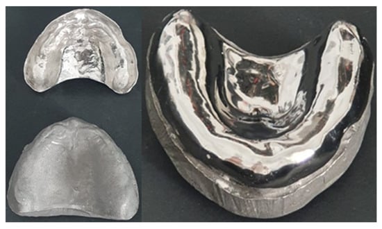 - The counter muffle was closed with type III plaster and placed in the press until the plaster hardened. Subsequently, the muffle was opened, removing the metal base (Figure 6), and the acrylic was produced based on the supplier’s instructions.