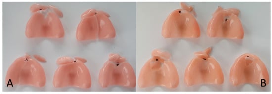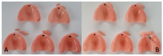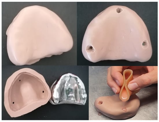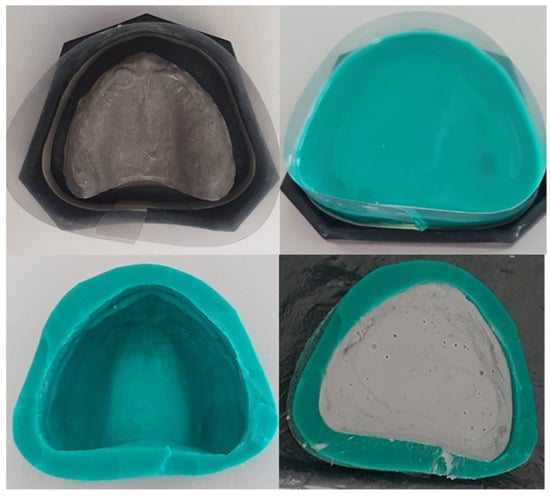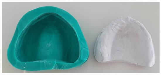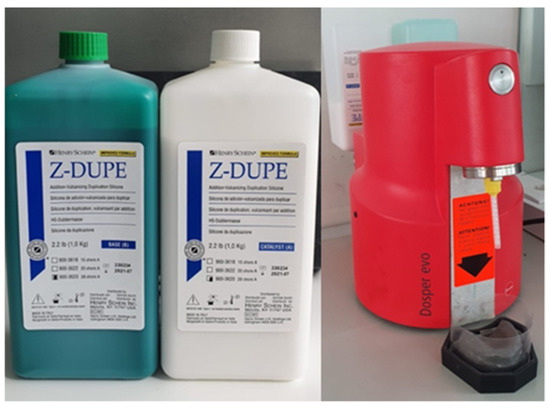 - The multiplication of the prefabricated mold was carried out with a Dosper Evo (Dreve Dentamid GmbH, Unna, Germany) duplicating machine using the Z-Dupe 28 shore A silicone (base + catalyst) (Henry Schein, Melville, NY, USA) (Figure 2).