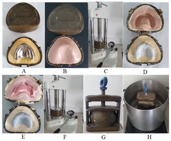 - We placed the acrylic between the mold and the wall, closing the muffle again with the help of the press (Figure 6), placing them in a pan with hot water following the manufacturer’s time and temperature recommendations.