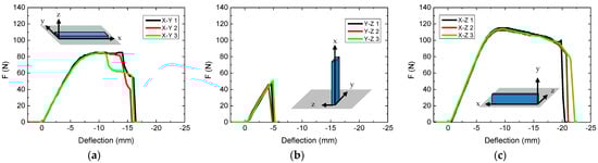 Comparing the three nominally identical specimens per sample, the force-deflection curves are quite similar for each build orientation. This shows that printing more samples is not necessary since no large deviations can be expected. Only in the case of the x–y plane (Figure 1a), one of the samples shows a behavior different from the others, which can be attributed to fully breaking, while the other specimens were not completely separated.