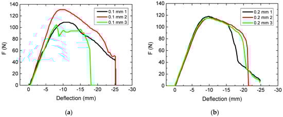 Force-deflection curves, measured in the 3-point bending tests for varying layer thicknesses: (a) 0.1 mm; (b) 0.2 mm.