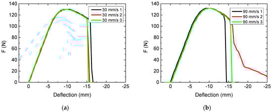 Force-deflection curves, obtained from 3-point bending tests for various printing speeds: (a) 30 mm/s; (b) 90 mm/s.