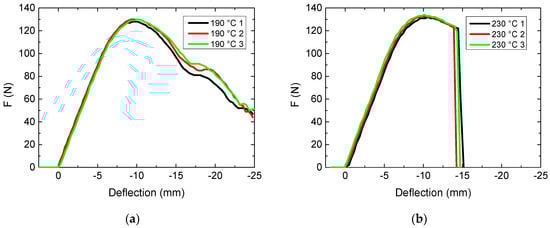 Force-deflection curves, obtained from 3-point bending tests for various nozzle temperatures: (a) 190 °C; (b) 230 °C.