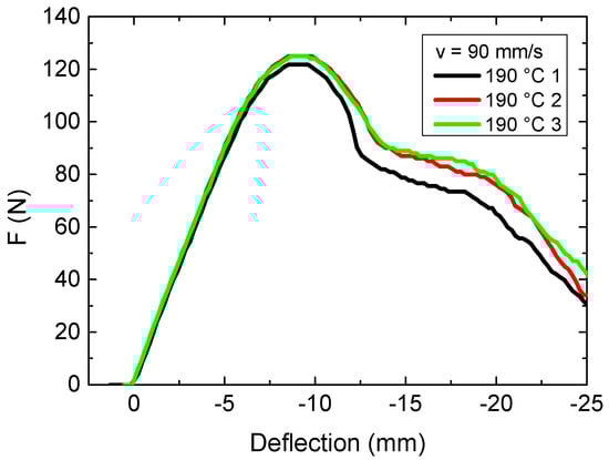 Force-deflection curves, obtained from 3-point bending tests for a nozzle temperature of 190 °C, a velocity of 90 mm/s and an x–z orientation.