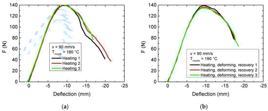 On the one hand, Figure 8a shows clearly that heating the sample is supportive for the maximum force. On the other hand, this maximum force is not significantly reduced by one deforming and recovery cycle (Figure 8b). This suggests that the preparation of finger orthoses and similar orthoses is possible by 3D printing a flat shape, followed by bending it to fit it to a proband’s finger. Instead, the whole curve becomes slightly broader, meaning that larger bending is possible without a break of the sample, which is even advantageous for the application of 3D-printed orthoses. Studies of other groups showed for some 3D printing materials that either forced cooling or temperature post-treatment could be used to increase maximum force and displacement at break [41,42,43]; however, tests of mechanical properties after deformation and recovery of the original shape usually show slightly reduced mechanical properties [44].