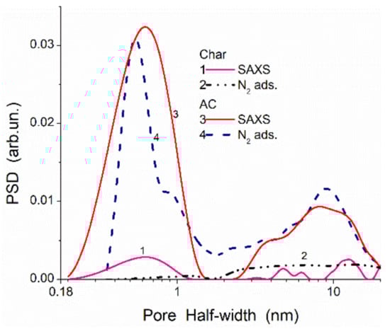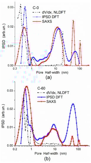 Comparison of pore sizes (PSDs) calculated from the N2 adsorption and SAXS data for samples (a) C−0 (phenol–formaldehyde char, SBET = 549 m2/g, char with zero burn-off) and (b) C-60 (AC with 60% burn-off, SBET = 1999 m2/g).
