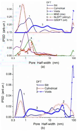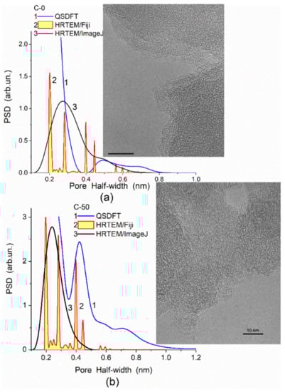 In the adsorption methods, the adsorption–desorption isotherms of various probes can give different textural characteristics because the accessibility of a surface in narrow pores depends strongly on the molecular sizes of probe adsorbates. To obtain accurate textural (or morphological) characteristics, the adsorption data should be treated using molecular density functional theory (DFT) methods (such as nonlocal DFT (NLDFT), quenched solid DFT (QSDFT), 2D-NLDFT) or other well-developed methods. For example, a DFT method developed [,] gives better PSD than NLDFT since the DFT PSD correspond to the SAXS PSD in a broad range of pore sizes in contrast to the NLDFT PSD (Figure 2) or QSDFT and modified Nguyen–Do (MND) PSD [,,,,] (Figure 3). However, in the range of narrow nanopores (<0.5 nm in half-width), the QSDFT method gives better PSD than NLDFT, DFT, or MND PSD compared to the PSD HRTEM computed with ImageJ (granulometry plugin) [] or Fiji (local thickness plugin) [] (Figure 4). Thus, the accuracy of the textural analyses depends strongly on a correct choice of experimental methods, conditions, and data treatment methods [,].