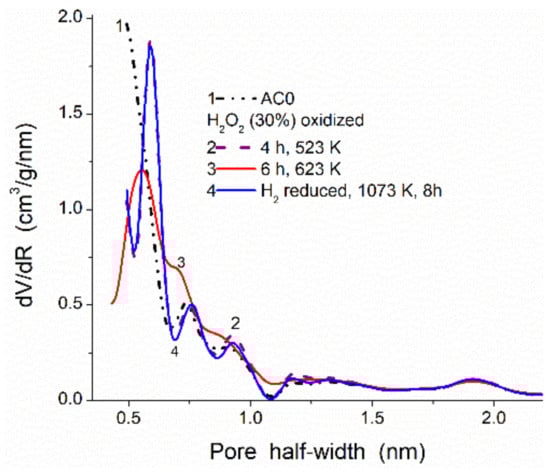 NLDFT PSD for AC initial (prepared from plum stones []), oxidized by H2O2 for 4 and 6 h, and reduced by H2 at 1073 K for 8 h (SBET = 1054, 1149, 1162, 1201 m2/g, Vp = 0.720, 0.723, 0.713, 0.733 cm3/g, respectively).