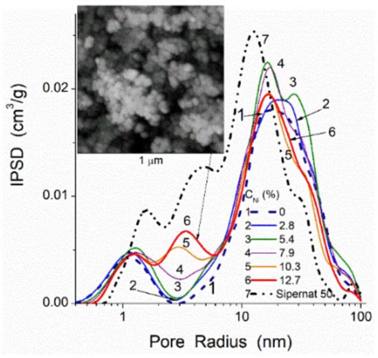 SCV/SCR PSD of carbon/silica/Ni composites formed upon carbonization (500 °C, nitrogen atmosphere, 3 h) of potato starch with addition of Ni(NO3)2 (0.5 to 2.5 mmol per 3 g of silica Sipernat 50 (503 m2/g, 1.29 cm3/g) and 27 g of starch): resulting final Ni content from 2.8 to 12.7 wt % in composites at SBET = 292, 326, 330, 322, 322, 320 m2/g; Vp = 0.89, 0.98, 1.07, 1.05, 0.98, and 1.00 cm3/g, respectively.