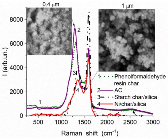 For hybrid adsorbents or polymer fillers, e.g., carbon deposited onto nanooxides (composed of NPNP) or porous oxides, the morphological and textural characteristics of final composites depend on many factors. First, the morphology, texture, chemical structure of a matrix and other components (e.g., carbon precursors, atmosphere composition) play an important role. Second, carbon precursor structure and reactivity and reaction products, as well as the formation of phases catalytically active in carbonization, e.g., metals, metal oxides (Figure 6) or effectively interacting with a matrix (e.g., hydrothermal treatment in formed water vapor due to the presence of O-, H-, OH-containing groups in the precursors) are additional and important factors. Third, reaction conditions (temperature, pressure, flow rate) and post-reaction treatments can affect the morphology and texture of the final composites. These conditions can also affect contributions of different kinds of carbons characterized by various contributions of disordered/ordered structures, which can be analyzed using Raman spectroscopy. Structures with sp3 C (D band in the Raman spectra at lower Raman shifts, Figure 7) and more ordered structures with sp2 C (G band at higher Raman shifts) are well distinguished in the Raman spectra. Typically, the D band is broader (due to a variety in disordered structures) than the G band, and their shapes depend on many factors. Note that for mechanically treated blends of more (silicas) and less (carbons) rigid components, it is the possible deposition of fragments of soft components onto the outer surface or into the pores of rigid particles. The analysis of these effects is possible within the scope of SCV/SCR using models of various shapes of pores in various materials [,]. The use of any firm software does not give correct results. Thus, the morphological, textural, and chemical characteristics of carbons and related composites determine their properties as adsorbents, fillers, catalysts, etc. Therefore, accurate evaluation of the characteristics of the composites is of importance to forecast the behavior of the materials upon their practical applications under different conditions, e.g., upon interactions with polymers.