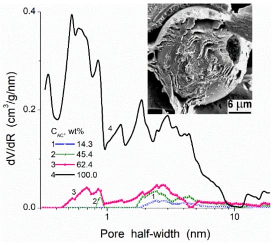 Pore size distributions (NLDFT, model of slit/cylindrical pores in carbons) for poly(vinyl alcohol) (PVA) cryogels (glutaraldehyde as a crosslinker) filled by activated carbon microparticles (SBET = 979 m2/g, Vp = 1.33 cm3/g) at different amounts (curves 1–3) and initial AC alone (curve 4); insert: SEM image of AC particle covered by PVA.