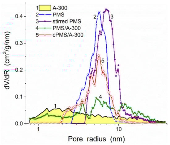 Differential (dV/dR) NLDFT PSD for A-300 (curve 1), dried polymethylsiloxane (PMS) hydrogel (2), dried, rehydrated, hydrocompacted, and dried PMS (3), stirred wetted PMS/A-300 without (curve 4) and with (curve 5).