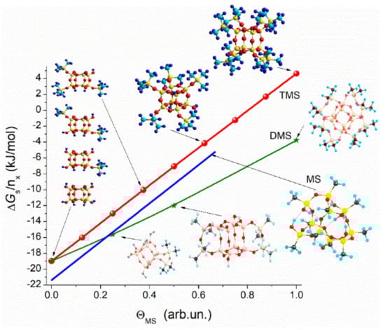 Gibbs free energy of solvation (SMD/ωB97X-D/cc-pVDZ []) divided by a number of hydroxyls in the initial clusters vs. the degree of substitution of the hydroxyls by the trimethylsilyl (TMS), dimethylsilyl (DMS) and methyl groups.